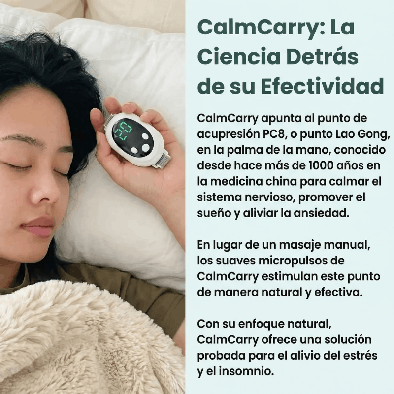 A diferencia de los métodos tradicionales, que pueden tener efectos secundarios y dependencia, CalmCarry utiliza suaves pulsos de microcorriente para estimular el punto de acupuntura PC8, lo que promueve la relajación natural y mejora la calidad del sueño.
