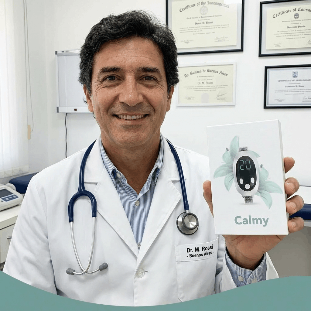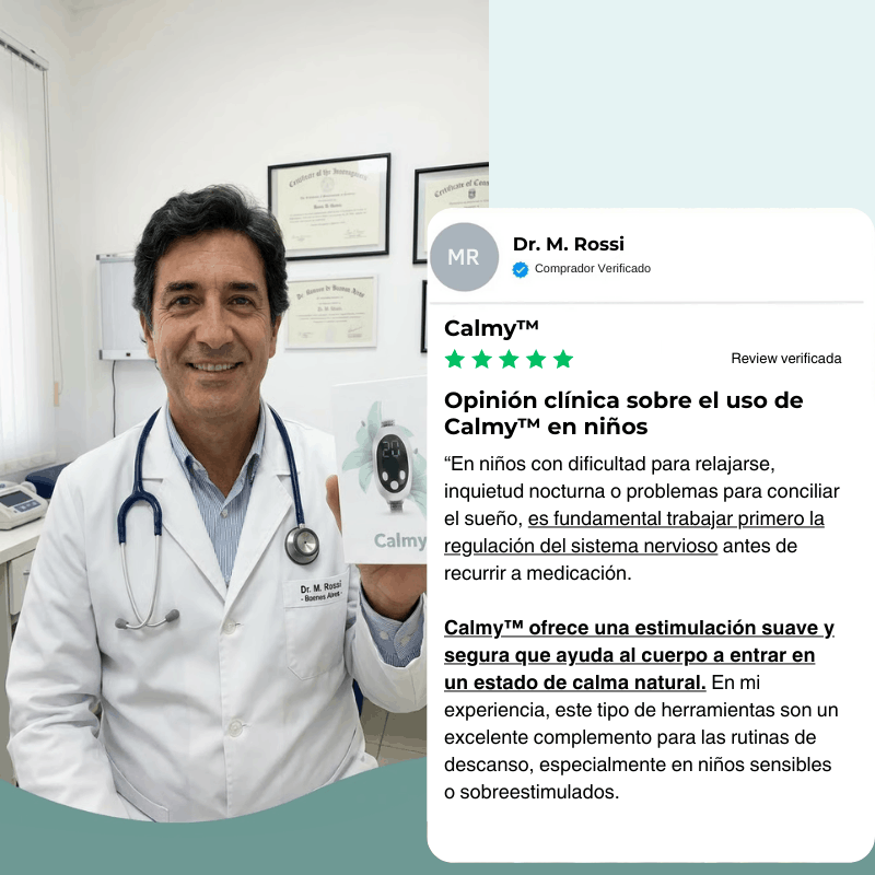 Calmy™ utiliza pulsos suaves de microestimulación para activar la capacidad natural del cuerpo de calmarse y relajarse de forma segura, tanto en niños como en adultos.
